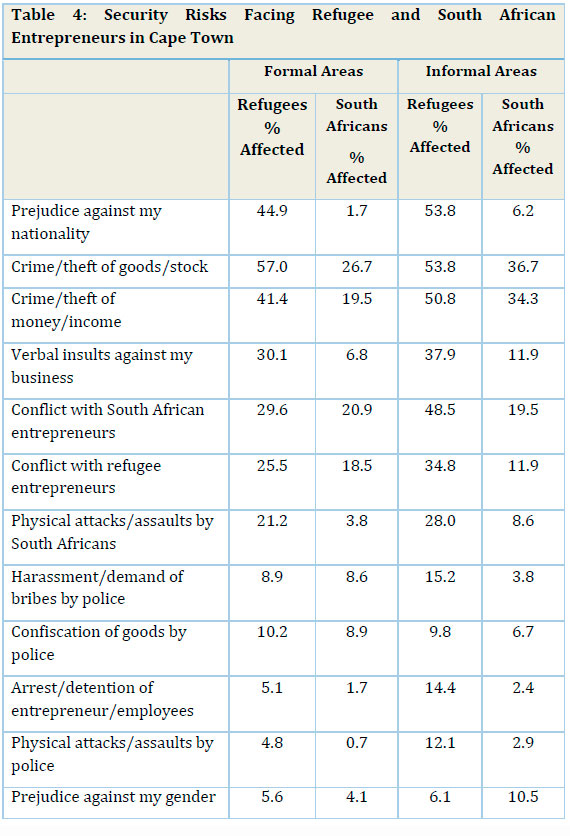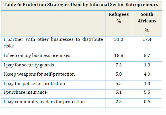 The dangerous and unpredictable environment in which informal entrepreneurs ply their trade in South African cities presents serious security challenges. It is clear from the previous section that while both groups are affected, refugees are much more vulnerable than South Africans to a range of risks. There is no a priori reason why this might be the case, other than the fact that refugees are targeted because their presence, which is viewed by citizens and officials as unwelcome and even illegitimate. This was certainly the view of most of the refugees interviewed for this study who consistently identified the manifestations of xenophobia as the major security problem they faced: