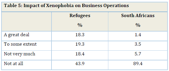 Unsurprisingly, refugees were far more likely than South Africans to say that their business operations had been negatively affected by xenophobia: 38% versus 5% (Table 5). There are two possible reasons for South Africans being affected: first, when collective violence occurs at a particular localised settlement, it is possible that in the general chaos and mayhem, South African-owned businesses may also be caught up in the looting and vandalism. As one South African owner noted "when these attacks start, it becomes difficult for us to move and every business becomes a target. Xenophobia does not only affect foreigners, it affects everyone" (Interview, 3 March 2016). A second explanation is that there are cascading, spill-over effects on those South African small businesses with cooperative, dependent relationships and linkages with affected migrant-operated businesses (Peberdy, 2017).