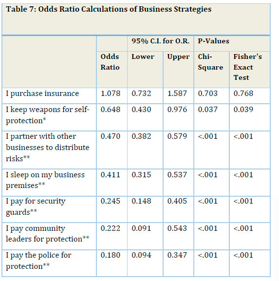 A number of studies have suggested that to lower the risks of victimisation, migrants adopt various measures to protect themselves and their employees (Gastrow, 2013; Hikam, 2011; Gastrow & Amit, 2015; Smit & Rugunanan, 2014). This survey sought to establish how common some of these strategies actually are and whether they are also adopted by South Africans (Table 6). One of the most common strategies is risk-sharing by partnering with other businesses. Nearly one-third of refugees and 17% of South Africans adopt risk-sharing through partnership. Sleeping on business premises (often a modified container) is a strategy pursued by both groups but, again, by more refugees (19% versus 9% of South Africans). There have been several high-profile shootings of robbers by refugees under attack but this survey found that only 6% keep weapons for self-protection. Other strategies (pursued by less than 10% of refugees and 5% of South Africans) include paying security guards and paying protection money to the police or community leaders. Around 5% of both groups purchase insurance. Table 7 analyses if the differences between the refugees and South Africans are statistically significant. With the exception of paying for insurance, refugees were far more likely than South Africans to adopt strategies of self-protection. Refugees were five times as likely to pay for protection and twice as likely to sleep on their business premises and to partner with others to distribute risk.