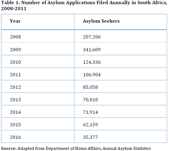 From 2008 to 2011, South Africa received the highest number of individual asylum applications globally, with a peak of over 300,000 applications in 2009 (Table 1) making it the world's largest recipient of asylum seekers that year. This fact caused delays in adjudication times and allowed economic migrants without a legitimate asylum claim to reside and work legally in the country. The increase in asylum claims led the Department of Home Affairs "to implement restrictive practices and policies, stemming both physical access at the border and at the refugee reception offices (RROs), as well as access to protection in adjudication procedures" (Johnson and Carciotto, 2016:169).