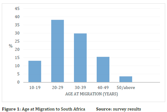 The study assessed for association between the ages of migrants and when they migrated to South Africa in order to analyse the effects of the crisis on age differences in labour migration to South Africa. Regarding the ages of the migrants, most of them (34 out of 84, or 38.1%) were young people in their twenties (20-29), followed by those aged 30-39 (29.8%). This indicated that most of the labour migrants from this region to South Africa were aged 20-39, their prime active ages (Figure 1). This confirmed other studies conducted in the host country, which found that most of the Zimbabwean migrants in South Africa were aged 21-40 years old and in the middle of their work and family life (Mosala, 2008). The crisis also contributed to the migration of people aged 40 years or over (15.5%) since they were also under pressure to provide for their families. Under normal circumstances such people are less likely to migrate than their younger counterparts. The remainder (13.1%) constituted members who migrated in their teens. This indicates a serious problem since most of them had barely completed secondary school at the time of migration.