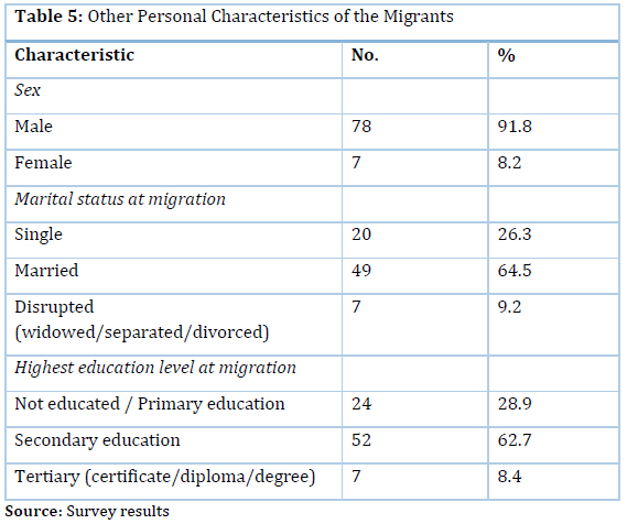 An overwhelming majority (78 out of 85, or 91.8%) of the migrant members was male, which indicates that labour migration from south-eastern Zimbabwe to South Africa remains male dominated (Table 5). This means that there was no change in the gender composition of labour migrants from these districts in south-eastern Zimbabwe to South Africa. This was contrary to the study by the ZYC (2014) and others, which suggested increased feminisation of labour migration in Africa. Instead, the current study confirmed the tradition among males to migrate alone, leaving women and children behind. This confirmed the BBC's (2015) documentary on the 'city of women' in Burkina Faso where most young men migrate to Italy. This is likely to be associated with negative consequences for women who, besides being denied of their conjugal rights for prolonged periods, raise families alone.