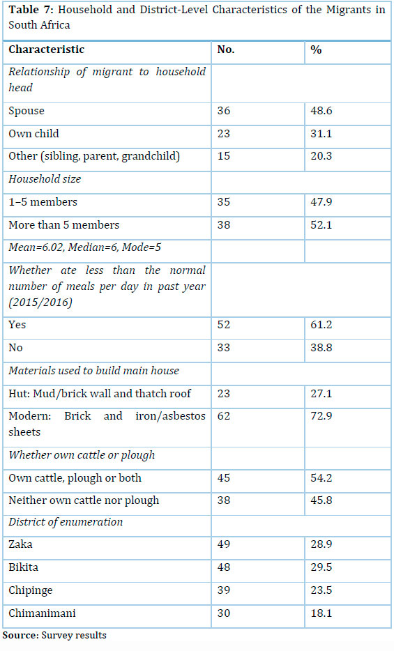 Slightly more than half of the migrant members (52.1%) came from large households made up of six or more members. The average household size was six members. This was typical of rural areas in Zimbabwe where the total fertility rate (TFR) is six children per woman on average. Large households were likely to be poor and experience food shortages, making them likely to send one of their members into migration to South Africa. As found already, poverty and food shortages were the reasons for migration for the second and fourth largest proportions of the migrants in South Africa (Table 1). Southeastern Zimbabwe is vulnerable to droughts since most of it belongs to agro-ecological regions IV and V, which receive low rainfall of below 500mm per annum. This region was not spared during the drought that hit the country during the 2015/2016 farming season. For instance, The Standard (2016) reported that Chipinge district in south-eastern Zimbabwe was one of the most affected areas. Consistent with the effects of this drought, the majority (61.2%) of the households reported that they ate fewer meals than usual in the past year (Table 7). This should have contributed to the large proportions of members of these households that migrated to South Africa during 20132015.