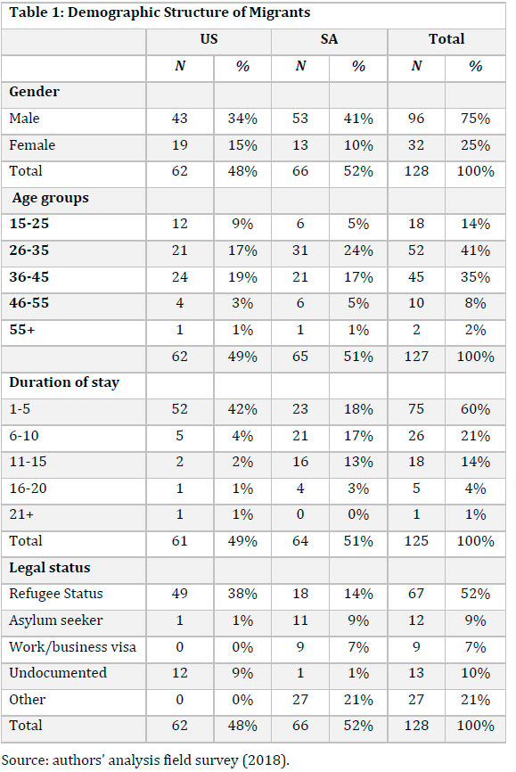 This analysis considers the system efficiency of migrants in the U.S. and South Africa. In the analysis, we used empirical data from the two countries in a bid to understand the structural challenges faced by migrants living in both countries and to identify lessons that can be learned. The results are presented and discussed below. Using a structured survey questionnaire, a sample of 132 respondents, representing 19 countries, were successfully interviewed. The countries represented were Burundi, Cameroon, Congo Kinshasa, the DRC, Eritrea, Ethiopia, Ghana, Iraq, Jordan, Kenya, Libya, Nigeria, Pakistan, Rwanda, Saudi Arabia, Somalia, Sudan, Vietnam and Zimbabwe. Four countries -Somalia, Nigeria, Eritrea and Nigeria - make up over 50% of the sample. Eritrea was the country most represented in the U.S. with 26%, while Zimbabwe was the country most represented in South Africa, with 23%. The results show that men continue to dominate in the flow of migrants. Males were comprised 75% of the sample, while females comprised 25%. However, male migrants in the U.S. constituted 34% compared to 41% in South Africa. The majority of these migrants (76%) were age 26 to 45 years. In addition, refugee status was by far the dominant documentation possessed by the migrants.