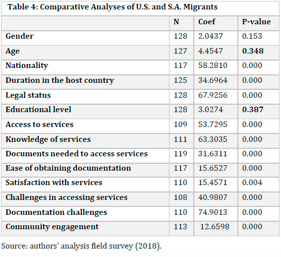 Table 4 shows an association of system efficiencies and inefficiencies using the derived variables of the U.S. and South Africa. It shows the areas of common characteristics or similarities in terms of access to services and system inefficiencies. We applied the Pearson Chi Square statistical technique, which measures the level of association between two categorical variables. The Pearson Chi-Square, measured at less than 0.05, shows that there was a strong association of these variables for both countries. For age, gender and education, there was no significant difference, which generally corresponds to the literature on the age and level of education for most migrants (Dinbabo, et al., 2017). Based on this, our hypothesis was that there is no difference in system efficiency and migrant access to basic services.
