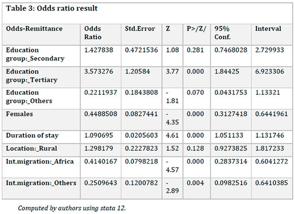 Table 3 below with the results, shows the estimated odds of the logistic model for the study after 4 iterations. The odds of the emigrants sending money home is categorized as the probability of the emigrants sending money home (yes or 1) as opposed to the emigrants not sending money home after migration (no or 0). The odds ratio column represents the odds of Y = 1 (sending money home) with the change in the independent variables. If the odds ratio is greater than one, then the odds of Y = 1 increase but if the odds ratio is less than 1, the odds of sending money decreases. With the focus on the level of human capital development in education attained by the emigrants before migration, the increase in the education levels of the emigrants increases the odds of the emigrants sending money, is higher than the emigrant with primary school education only. The tertiary education level proved significantly different from the other levels of education or skills attained before migration. The increase in the duration of stay by the emigrants also increases the odds of the emigrants' remittances. The presence of the emigrants from the rural areas also increases the odds of the remittance. On the other hand, the presence of female emigrants decreases the odds of the remittances, showing them to be lower than with the presence of males. Additionally, the presence of emigrants from African and other countries decreases the odds of emigrant remittance, making them lower than those of the Organization of Economic Cooperation and Development (OECD).
