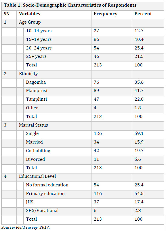 The study selected a total of 213 respondents from the 4 locations. From the results, the majority (44.4%) of the respondents were within the ages 15-19 years, 25.4% were within 20-24 years, and 21.5% were 25 years and over. This ties in well with the findings of Zaami (2010) and Baah-Ennumh et al. (2012), who claim that more teenage girls than matured women develop an interest in migration. In terms of ethnicity, 41.7% were Mamprusi, 35.6% were Dagombas, and 22% were Tamplinsi. Tmajority of the respondents were not married (59.1%), 15.9% were married, and 5.6% were divorced. In terms of the education levels of respondents, 54.5% of them had a primary level of education, 25.4% had no formal education, and only 2.8% had SHS/Vocational education (see Table 1). From the results, those with primary education all dropped out due to lack of interest, and those with junior and senior high levels of education left school due to failure.