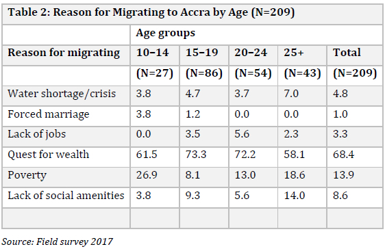 This finding resonates with the findings of Awumbila and Ardayfio-Schandorf (2008) that the reasons for migration from the rural North to the urban South include not only the limited economic opportunities but also the poor social amenities and cultural restrictions that partly account for female poverty. While socio-economic and cultural factors act as push factors for female migration from the North, relatively favourable factors act as pull factors in various destinations in the South. For example, Awumbila et al. (2014) argues that the pattern of internal migration in Ghana has also been influenced by the stark differences in the levels of poverty between the North and the South. Employment opportunities resulting from the growth of industries in urban areas like Accra have contributed to the rise in the movement of young people from the North to the South (Yaro, 2004; Van der Geest, 2011).