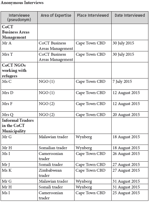 To probe how the City sees foreign Africans, this study included interviews of mid-level officials in Trading Licensing services. At this level, the responses revealed that City officials (much like Cape Town's DA mayors) were not clear about what was meant by terms such as 'asylum seeker' or 'refugee'. Informants employed by the City indicated that they were not aware of any policies about foreign nationals.