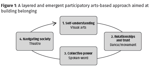 As young people with migration experiences build their lives in new contexts, their connectedness to who they are, to other people, to place and to culture underpin whether and how a sense of belonging is built in their lives. Belonging as a concept matters in young lives as it is underpinned by feelings of acceptance, inclusion and self-determination. The realization of belonging can have important implications for young people's wellbeing and development. This paper shares the barriers to belonging for young migrants in South Africa, and how the pain of past experiences, and the exclusions they are navigating in the present constrain their sense of agency, impacting self-worth and relationship formation. We share how a child and youth care center in Cape Town specializing in supporting young migrants and young people with experiences of trauma, innovated with a group of young women through participatory arts-based methods towards building belonging. We found that layering multiple arts methods can support young people to connect to their cultural roots and personal relationships, re-build trust, reimagine their identities as part of a collective and challenge power relations around gender, nationality and generation. We found that building belonging should be seen as a continuous learning process, that builds young people's reflective capacities to understand self and others and to make sense of the interaction between past, present and future. In turn, belonging provides an important conceptual tool for youth-led, context-specific approaches to working with young migrants, including on youth transitions.