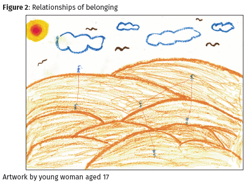 The young people involved in this process have, through the embodied practice of making art, generated an understanding of belonging that is both relational and in process. Building belonging is therefore not about working towards a fixed outcome or identifiable end goal; it is a continuous process that is deeply interconnected with the changing dynamics of young people's lives. Young people are looking to build self-worth, feelings of safety, decision-making power and supportive relationships, in order to support their capacities to navigate these dynamics. This project's findings indicate that participatory arts methods can create a space for understanding and realizing belonging in young people's immediate lives, and contribute to the development of capacities for building belonging as young people construct their future, independent lives.