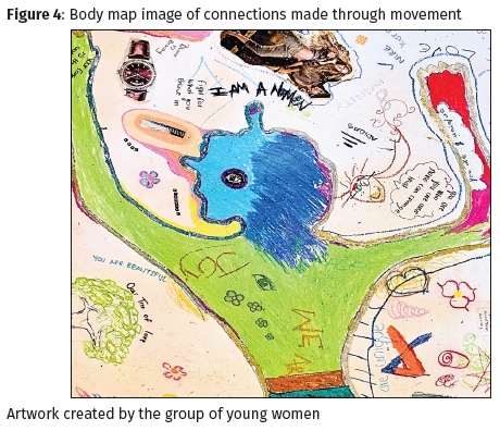 As the artwork shows, this space gave the young women a platform from which to recognize and value their uniqueness as their beauty, to articulate the power that they have to fight for what they believe in, and to establish that others do not have the power to change who they are. This transition from personal expression in the visual storybook work, to nonverbal dialogue through movement, to a collective articulation of self and identity was a powerful way of building trust in others, to understand the connections between bodies, lived experiences and aspirations for change. The body map presents evidence concrete example of this important transition.