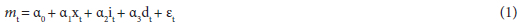 Where t represents the years and m stands for the number of economic migrants or refugees; x is a matrix containing variables that have an undeniable effect on migration: political stability for instance, has an undeniable effect on the number of refugees; i is the variable of interest; that is, the determinant for which we want to test robustness and sensitivity; deD is a matrix containing a limited number of other doubtful determinants of international migration taken from the pool D of n available determinants. Finally, s is the error term and a (i=1,2,3) are parameters to be estimated.