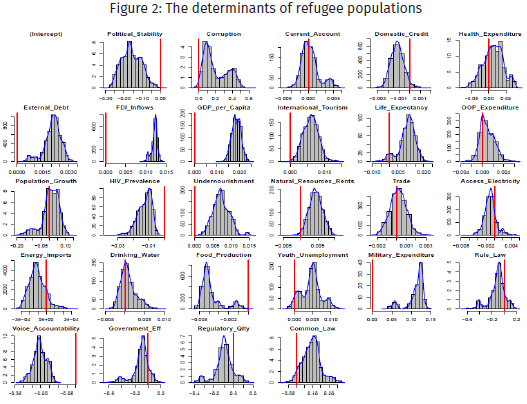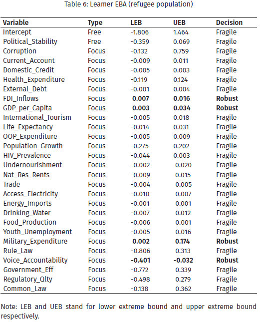 The results reveal that domestic credit, health expenditure, natural resources rents, youth unemployment, population growth, HIV prevalence, trade, and voice and accountability are robust determinants of net migration while FDI inflows, international tourism, HIV prevalence, corruption, GDP per capita, undernourishment, food production, military expenditure, voice and accountability, domestic credit, natural resources rents, youth unemployment, rule of law, government effectiveness, common law, external debt, life expectancy, and regulatory quality are robust determinants of refugee populations.