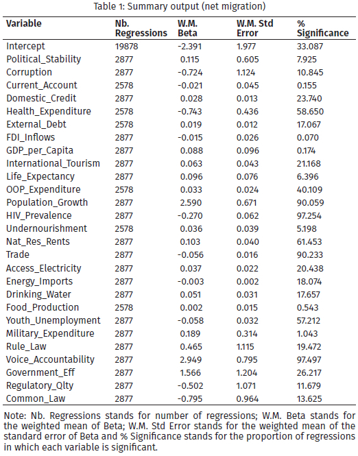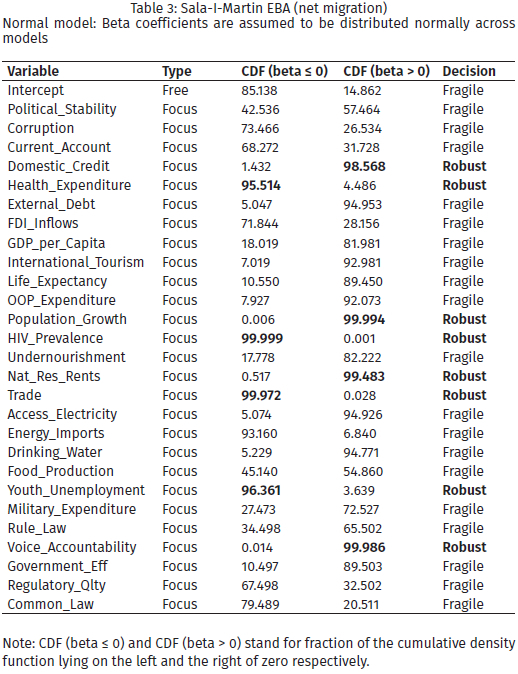 Table 3 reports the EBA proposed by Sala-I-Martin (1997) in which it is assumed that the coefficients follow a normal distribution. The results show that domestic credit, health expenditure, natural resources rents, youth unemployment, population growth, HIV prevalence, trade, and voice and accountability are robust determinants of net migration.