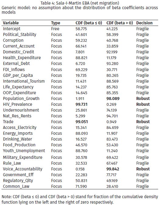 As for the alternative results reported in table 4, there are coming from a generic model in which coefficients are not assumed to follow a particular distribution. The table shows that net migration is robustly influenced by population growth, HIV prevalence, trade, and voice and accountability.