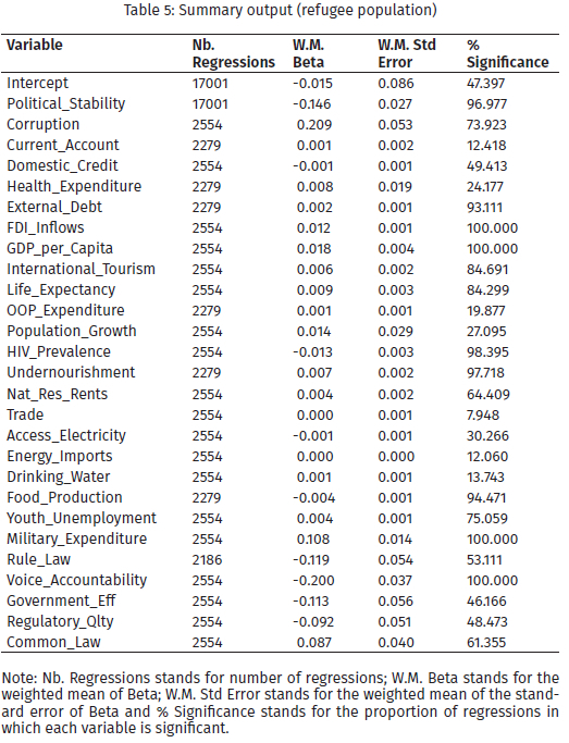 In order to address those issues, some restrictions are imposed upon the EBA used in this paper. Following Levine and Renelt (1992), the list of variables included in x and allowed in all regressions has been reduced. Thus, only one explanatory variable (political stability) is included in all the models dealing with refugee populations and no variable is considered to have an undeniable effect on net migration. Furthermore, for each variable of interest i, the pool of variables from which d can be selected is restricted by excluding all the variables that, in theory, might point to the same phenomenon or be highly correlated. So, health expenditure and out-of-pocket health expenditure are not allowed in the same model. This is also the case for budget deficit (current account) and external debt, and for undernourishment and food production. Following Hlavac (2016), the variance inflation factor (VIF) is not allowed to exceed 7 in order to address multicollinearity. Moreover, in order to give more importance to estimation results from models with a better fit, each regression is weighted by its own likelihood ratio index (LRI).