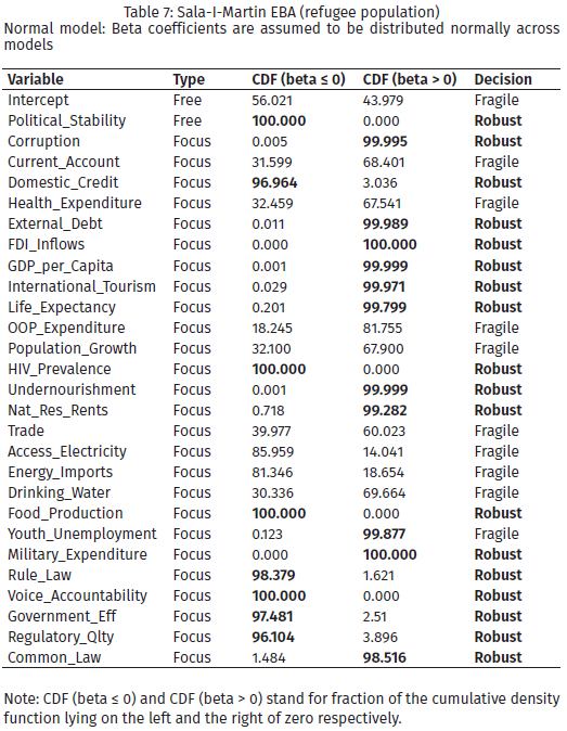 Table 6 reports the EBA proposed by Leamer and Leonard (1983). It shows that FDI inflows, military expenditure, GDP per capita, and voice and accountability are robust determinants of refugee populations. Table 7 and Table 8 report the EBA proposed by Sala-I-Martin (1997) for the normal and generic distributions, respectively. On the one hand, assuming that the coefficients follow a normal distribution, it is found that political stability, FDI inflows, international tourism, HIV prevalence, corruption, GDP per capita, undernourishment, food production, military expenditure, voice and accountability, domestic credit, natural resources rents, youth unemployment, rule of law, government effectiveness, common law, external debt, life expectancy, and regulatory quality have a robust impact on refugee populations. On the other hand, the generic model reveals that political stability, FDI inflows, international tourism, HIV prevalence, corruption, GDP per capita, undernourishment, food production, military expenditure, voice and accountability, and external debt are robust determinants of refugee populations.