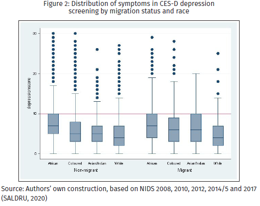 In Figure 2, we report the distribution of symptoms by migration status and race. The migrant sub-population group reported higher depressive scores across all the races. A total of 25% of migrant Asian/Indians had depressive scores above the cut-off of 10, followed by African migrants at slightly below 25%. Close to 20% of migrant Coloureds also reported depressive scores higher than 10. Despite a high number of outliers, the proportion of non-migrants reporting depressive scores of 10 or higher was less than that of migrants.