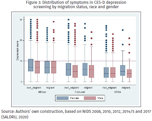 Figure 3 provides an overview of the distribution of symptoms in CES-D depression screening by migration status, race and gender. Based on information in the figure, there is no significant variation in the distribution scores of both migrants and non-migrants across both genders within the African racial group. About 25% of female migrants, male migrants and male non-migrants exceeded the threshold of 10 to qualify as displaying significant depressive symptoms. The only exception is the category of African non-migrant females who have more than 25% displaying significant depressive symptoms. The African race constituted the group with the highest depression scores compared to the other racial groups followed by Coloureds and lastly, the White racial group.
