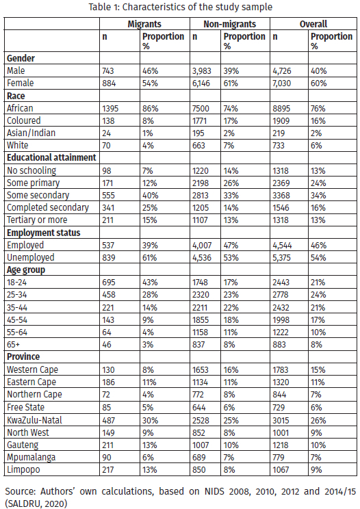 Table 1 provides an overview of the sociodemographic characteristics of the study population. The sample consisted of more females compared to males in both the migrant and non-migrant population groups. The sample majority is also predominantly African, with 76% of the study sample being of the African race. Over 60% of both the migrant and non-migrant population groups have secondary school education. The unemployed comprised a bigger proportion of the study sample across both migrant statuses. More than half of the sample were aged between 18 and 44 years. Within provinces, the majority of the sample members were from KwaZulu-Natal.