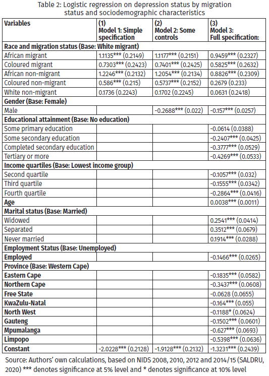 The regression results in Table 2 reveal that all other racial groups in both migrant and non-migrant groups were more likely to be depressed compared to White migrants in models 1 and 2. The results were statistically significant except for White non-migrants across all 3 models. However, there were no statistically significant differences between White migrants and Coloured non-migrants, as reflected in Model 3.