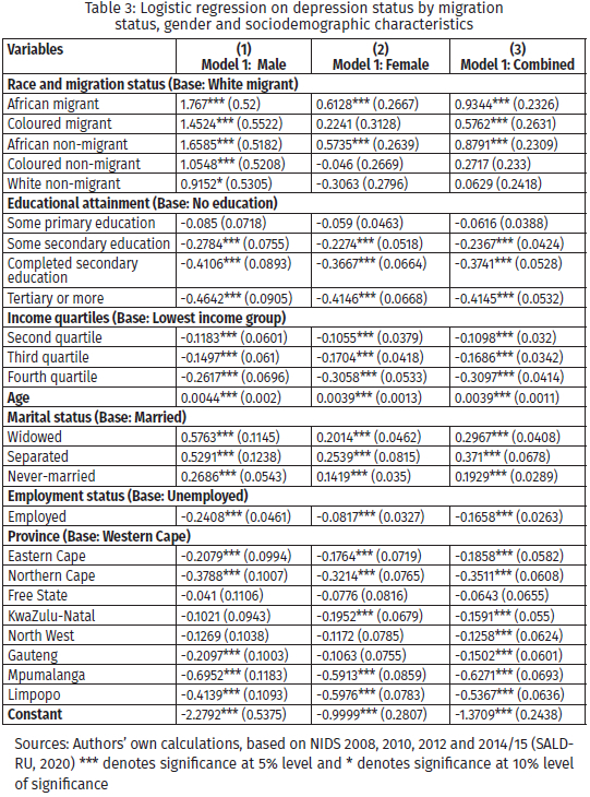 The study then appraises the determinants of mental health status in South Africa by gender and sociodemographic variables. Table 3 summarizes the logistic regression models to give a clearer picture of how gender influences the risk of depressive symptoms. Model 1 evaluates the effects of migrant status and sociodemographic variables on depression status for males. Model 2 undertakes a similar analysis for females, with Model 3 reporting the combined effect.