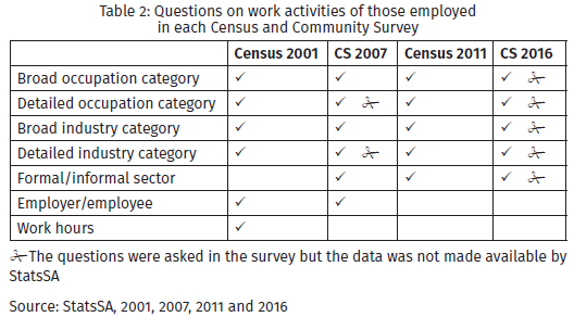 The four censuses and CSs did not pose the exact same questions on work activities (see Table 2). Furthermore, it was not possible to obtain the CS 2016 data on labormarket activities. Even though the information was captured by StatsSA, the data was not released. Additionally, it was not possible to obtain the full census data for the UK (2011), New Zealand (2013), and Australia (2016), as either the data is only accessible to natives living in these countries, or exorbitant costs are charged by the statistical bureaus of these countries to access and construct detailed statistical tables. Hence, only certain tables could be compiled using the free online table generation tool in the statistical bureau websites.
