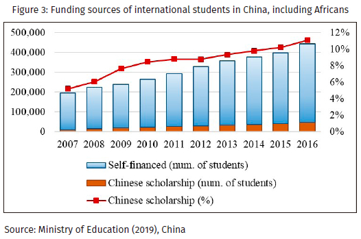 Moreover, while there is a notion that African students in China are motivated by financial incentives (scholarship incentives mainly) (Haugen, 2013), current trends depict a different situation (Li, 2018). From 1976 to 1988, all African students in China were on scholarships. This trend changed from 1989 with two students studying in China on a self-financed basis and the number of those without scholarship exceeding scholarship holders for the first time in 1994 (Li, 2018). Since 2006, the number of self-financed African students in China has always exceeded their counterparts on financial aid, and this was as a result of the 2006 FOCAC summit when new forms of educational exchanges and partnerships, as well as more flexible visa application processes, were introduced (King, 2014; Li, 2018). In addition, the demand for alternatives to the expensive Western education, coupled with increased awareness of China as a destination for education among Africans of middle- and upper-middle-class status, and Africans doing business in China who are able to fund their education also contributed to this increase in self-financing African students in China. Consequently, there were as many as 41,322 self-financed students compared to 8,470 students on scholarships as at 2015 (Li, 2018). In fact, the proportion of overall international students on scholarships in China as at 2016 was approximately 11%, rising from about 5% in 2007, as shown in Figure 3 (Ministry of Education, 2019). Therefore, one could argue that China has been able to ground its higher education internationalization agenda in Africa in the institutional realities of the most crucial partners, universities, and colleges (Helms and Rumbley, 2017). This reality notwithstanding, it must be emphasized that the success in drawing educational institutions in the China-Africa educational partnership is attributable to the prevailing political and governance structure of China, which has strategically used the HEIs as instruments to achieve the desired soft power and internationalization outcomes (Mok, 2000, 2014; Mok and Chan, 2008; Mok and Ong, 2014).
