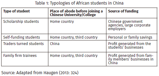 While the policy aspect of the engagement is intriguing, the nature, conditions, and prospects of the students involved in the multi-faceted arrangements between China and the African nations require further inquiry. African students in China are far from homogenous, at least from a financial point of view as well as their pre-schooling situation. A previous study by Heidi Haugen (2013) provided a typology of African students in China, which serves as a significant starting point to understanding the nature of the people involved in the educational engagement and their aspirations. In that study, various kinds of students were identified in terms of: funding arrangements (four kinds), their schooling journey (four kinds), and the places of origin before commencing their studies, as shown in Table 1. Thus, while various policies are encouraging several Africans to seek higher education in China, attention must be given to the varying current and prospective integration and development of the students involved, given their heterogeneity. More importantly, this call is essential to the sustainability of the China-Africa education collaboration, as the experiences of the students during and after their studies are critical to others planning on embarking on similar journeys. As Haugen (2013) demonstrates, the negative experiences of African students can create a serious dent on the ambition of China to increase its soft power in Africa through educational engagements.