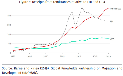 Development conceptualized as self-improvement (Ndlovu-Gatsheni, 2018) has been associated with migration through a variety of proximate factors. The extant literature on intra-African migration as well as migration from Africa to destinations outside the continent has focused predominantly on the receipt of mostly cash remittances. This has served as the litmus test for whether migration has potential developmental implications at diverse spatial levels - micro level on individuals and families left behind, meso level on migrant origin communities, and macro level on national economies (Gnimassoun and Anyanwu, 2019; McAuliffe and Triandafyllidou, 2021). While narratives on the micro- and meso-level effects might be relatively evident, macro-level claims are more spurious because of the many confounding factors that ultimately determine national development. This is in spite of the World Bank's continuing linkage of remittances to national development. Good governance systems, availability of infrastructure, conducive environment for investments, extension of rights to diaspora members, clamping down on corruption, and education on productive uses of remittance receipts, among others are prerequisites for cash remittances to trigger or support development at the macro level. Globally, remittances have proven to be less volatile and a reliable source of income to developing countries compared with foreign direct investment (FDI) and official development assistance (ODA), as demonstrated in Figure 1. This narrative about the viability of remittances as a foreign exchange earner is informed by the collation of inexact data on remittance receipts. While there has been an appreciable hike in the number of remittances-sending agencies as well as the deployment of innovative technologies using virtual platforms, large volumes of remittances are sent through informal channels (Teye et al., 2017; World Bank, 2021). These channels include "Unity-Link" operating from London, "Sendwave" that facilitates the sending of remittances from the USA, UK, Canada, and the EU, "Xe" foreign exchange company that is based in Canada but facilitates transfers to 200 countries in 100 currencies, "World Remit" that operates from the UK, and mobile phone-based money transfer services such as "M-PESA" originating from Kenya, among others. Despite the use of informal channels, the fact that remittance figures are produced by credible entities such as the World Bank and the United Nations Department of Economic and Social Affairs (UNDESA) adds to the overall credibility of this narrative.