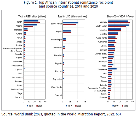 As noted by Ratha (2010), cash remittances can have wide-ranging effects on local economies, such as being used to stabilize local currencies, to reduce the depth and severity of poverty, to stimulate economic activity, to be used as collateral for foreign loans, and to boost the savings portfolio of recipients. Remittances can also support foreign currency reserves to cover the importation of goods and services. They also have the propensity to improve the credit rating of countries and their external debt sustainability. Figure 2 presents data illustrating that across the continent, the countries that receive the highest amounts of remittances, those that are sources of the highest amounts, and those whose economies rely heavily on remittances differ. Whereas Egypt, Nigeria, Morocco, Ghana, and Kenya top the recipients' list, South Africa, Angola, Mozambique, Morocco, and Namibia are the five leading sources of remittances in Africa. As a percentage of gross domestic product (GDP), Somalia, South Sudan, Lesotho, the Gambia, and Cabo Verde have the highest dependency on remittance income.
