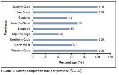While 100% of the physiotherapy department heads had responded to the survey and answered the questions related to types of ICU via e-mail (70%, n = 46) or telephonically (30%, n = 20) (Figure 1), 70% (n = 46) of the physiotherapy department heads completed the full survey. The completion rate per province is shown in Figure 2. Although Gauteng, KwaZulu-Natal, the Western Cape and North West provinces had the highest percentages of total respondents who completed the survey, the responses from the provinces occurred with equal probability (p = 0.09). Mpumalanga had the lowest response rate (Figure 2).