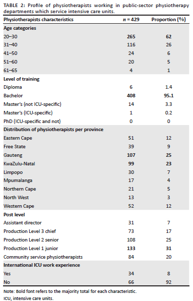 Staff shortages and limited numbers of skilled healthcare professionals may affect quality of care and patient outcomes (Garland & Gershengorn 2013; Mackay & Ellis 2002; Hinshaw 2011; Ntinga & Van Aswegen 2020). There is a paucity of published reports or papers on the age range; job ranks; qualifications; involvement in student supervision and training; and continuing professional development of public-sector physiotherapists in SA. The aim of this paper is to provide a clear picture of the organisation and structure of physiotherapy departments, the number and types of ICUs that need physiotherapy service provision and the profile of the physiotherapists working in the public-sector hospitals with existing ICU facilities in SA.