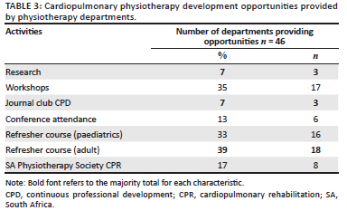 All physiotherapy departments completing the survey reported that they were active in providing opportunities for staff to become involved in postgraduate activities specifically focused on ICU care (Table 3). It was interesting to note that 7% (n = 3) of departments reported that staff were actively involved in research projects and/or journal clubs, while 39% (n = 18) of hospitals reported that their staff have completed the ICU refresher course provided by the South African Physiotherapy Society (Table 3).