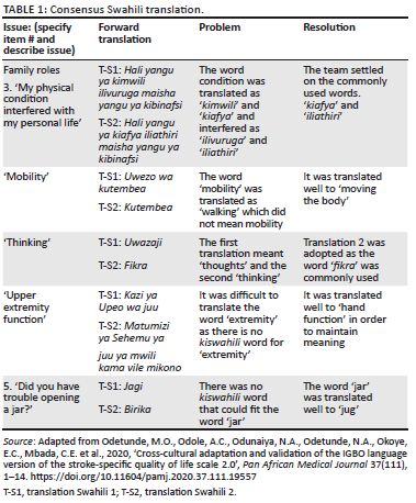 Like in most studies, the reconciling of the two Swahili documents produced in the forward translation process revealed that some words such as 'mobility', 'upper extremity function' and 'jar' were difficult to translate and therefore had to be borrowed. For instance, mobility was written as 'kusongesha mwili' (moving the body), upper extremity function 'matumizi ya mikono' (hand function) and jar as 'chupa' (bottle). The finding is similar to that of SSQOL Igbo version where extremity was translated as 'ability to use a hand' and jar as 'bottle cover' (Odetunde et al. 2020).