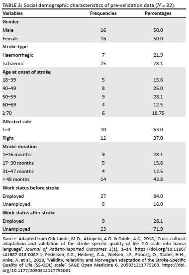 Thirty-two respondents completed both the original English version of the SSQOL and the PFSV of SSQOL questionnaires whereby 15 of the participants completed the English version and 17 the PFSV as shown in Table 5. This sample size was in line with Beaton et al.'s (2002) recommendations to include between 30 and 40 participants in studies of this nature in order to enable correlation of the responses of the two versions. The stroke onset mean age was found to be 53.69 years, s.d. = 14.05, with a median time of 4 months of stroke duration and an interquartile range of 1. These findings are similar to those of other studies that revealed people between the ages of 40 and 60 years are more affected by stroke (Ganvir et al. 2018; Pedersen et al. 2018; Odetunde et al. 2018, 2020). The majority (84%) of the respondents ranged between 40 and 69 years further confirming the aforesaid reports. Though the rate of stroke in young adults is increasing drastically, it is still recognised that the risk of stroke increases with age (Donkor 2018; Yangatimbi et al. 2020).