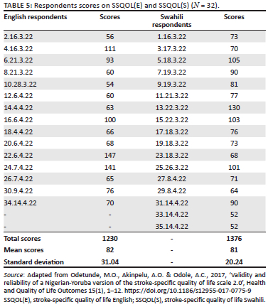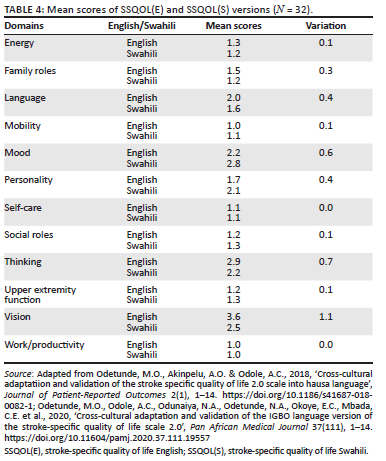 Further, respondents' mean scores were lowest in the work, self-care, social roles, mobility, upper extremity and energy domains. This again agreed partially with the Hausa translation study that showed lower scores on the work domain (Odetunde et al. 2018). This was associated with loss of function, which is a major stroke sequela (Ganvir et al. 2018). The total mean score and s.d. of participants in the English and Swahili version of SSQOL were 82, s.d. = 31.04 and 81, s.d. = 20.24, respectively, which indicates a good understanding of questions in the Swahili version (Beaton et al. 2000).