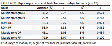 A multiple regression analysis revealed that dorsiflexion and plantarflexion muscle strength; dorsiflexion and plantarflexion ROM; as well as tibialis anterior and gastrocnemius muscle tone did not impact the knee angles (Table 6).