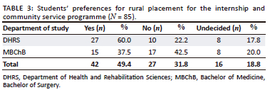 Sixty percent of DHRS students (n = 27) indicated they would consider rural placement for community service. Although MBChB students showed a lower preference for rural placements, there was no significant difference between MBChB and DHRS students (Table 3).