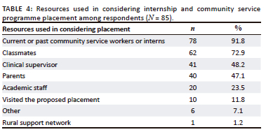 Multiple role-players were identified as influencing students' decisions around the choice of ICSP placement. The Rural Support Network (RSN), a UCT society aimed to raise awareness of rural healthcare needs among health science students, was not readily considered as a source of information by the respondents (Table 4).