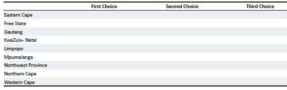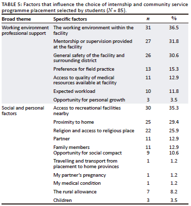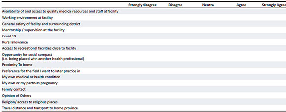 justifying the need to be placed close to support structures. Rural placements were considered potentially unsafe and removed from close contacts: 'Safety is very important if I'll be staying alone as a woman' (MBChB, female, year 6). 'Rural placement would not allow me to be close to loved ones' (DHRS, female, year 4), and 'I have to apply rural but safety concerns in South Africa is making me doubt a rural placement' (DHRS, female, 4th year).