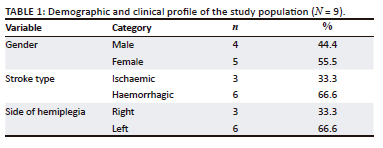 The team screened 428 patients for potential inclusion in our study. Four hundred and nineteen patients were excluded because of having had a previous stroke (n = 118), age not aligning to inclusion criteria (n = 92), individuals not being able to perform STS as required (n = 94), being clinically unstable (n = 25) and 90 patients being cognitively impaired. Nine participants were included in our pilot study, of which the majority were female (n = 5; 55.5%), had a haemorrhagic stroke (n = 6; 66.6%) and presented with a left hemiplegia (i.e. right hemisphere stroke) (n = 6; 66.6%) (Table 1).