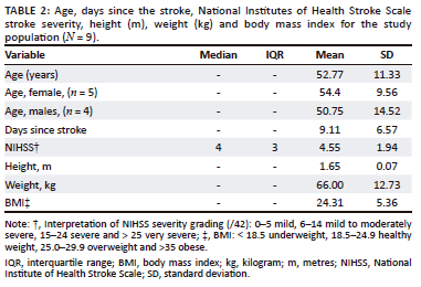 The MBS was used to assess participants' perceived effort when performing STS. The MBS appears to be a reasonable indicator of the intensity of exercise after stroke when performed at moderate (60% - 70% Vo2peak) but not high-intensity exercise level (80% Vo2peak) (Sage et al. 2013). A study carried out by Grant et al. (1999) tested a group of active male volunteers to determine which of the subjective scales, the Likert Scale, the visual analogue scale or the MBS, were more sensitive to change and reproducible in the assessment of general fatigue and breathlessness during sub-maximal exercise. In general, the MBS proved to be the most sensitive in assessing change (Roos & Eales 2002). To determine participants' severity post-stroke, the National Institutes of Health Stroke Scale (NIHSS) was used in our study. The NIHSS is most commonly used as a scoring system in stroke research trials; it is a valid, reproducible scale that measures neurological deficits for physical and cognitive functioning. The scale is scored between a range of 0 and 42, and the items are graded on a 3- or 4-point ordinal scale; 0 means no impairment and the higher the score the greater the severity of impairment. The severity of the stroke may be presumed based on the NIHSS scores as follows (Brott et al. 1989): (1) very severe: > 25, (2) severe: 15-24, (3) mild to moderately severe: 5-14 and (4) mild: 1-5. A calibrated scale was used to measure participants' weight in kilograms (kg), and a stadiometer was used to measure participants' height in centimetres (cm). Participants' body mass index (BMI) was calculated from these measurements.