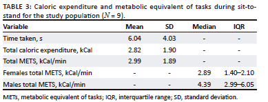 The mean METs of the participants during STS in our study was 2.99 (± 1.89) kCal/min indicating that the intensity level of this functional task was of moderate-intensity level. This finding was much higher compared to literature related to EE during STS in healthy individuals. In a study carried out by Júdice et al. (2016), they reported an EE of a single STS in a normal healthy population to be 0.32 kCal/min. In another study, also carried out in a normal healthy population, results showed that the EE during STS was 0.22 (± 0.09) kCal/min; however, they only had 19 participants with a mean age of 23.1 (± 1.9) years compared to Júdice et al. (2016) who had 50 participants with a mean age for males 32.5 (± 11.4) years and females 38.0 (± 15.7) years (Hatamoto et al. 2016). This indicates that our study participants with stroke used almost eight times more energy than the unaffected test participants in the Júdice et al. (2016) study. To the authors' knowledge, there are no other studies establishing the EE of patients with stroke during STS.