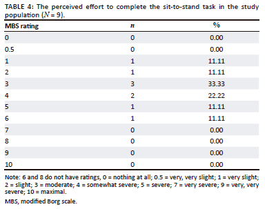 Our study showed the comparison between the perceived effort options, with the most common choice selected on the MBS being the 'somewhat severe' (33.33% [n = 3]) followed by the 'severe' (22.22% [n = 2]) category. However, when comparing the values between males and females, the male median rating was 4 (2.5 - 5.5), and the females was 3 (3 - 4). These values compared to the time taken are inversely proportionate, where the males completed the STS activity quicker (3.4 s [2.7-6.21]) compared to the females (6.08 s [5.5-7]). Yet the females rated the activity as 'somewhat severe' compared to the 'severe' rating of the males. The perception of STS will impact mobility at rehabilitation or home as it is a precursor to most mobility activities (Vena et al. 2015).