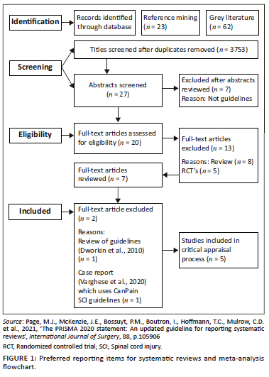The search occurred across the University of the Western Cape's databases: BioMedCentral, Cambridge Journals Online, CINAHL, Cochrane Library, Medline (EbscoHost), Medline (Pubmed), Sabinet Reference, SAGE Journals Online, ScienceDirect, SCOPUS, Wiley Online Library, Springerlink, PubMed, Guideline Central, and Agency for Healthcare Research and Quality. The following MeSH headings and keywords were used: chronic pain AND, clinical practice guidelines, AND spinal cord injury. Certain limits were chosen for each database, and the specifics are mentioned in Appendix 2. A review of the included articles' reference lists occurred to identify additional articles. A 'snowball' technique was used, in which citations within the included articles were searched if they seemed relevant to the scoping review research question (Arksey & O'Malley 2005). As seen in Figure 1, 23 references were identified through reference mining. In addition, other sources such as organisations, conferences and existing networks (grey literature) were also searched. As seen in Figure 1, 62 references were identified among grey literature.