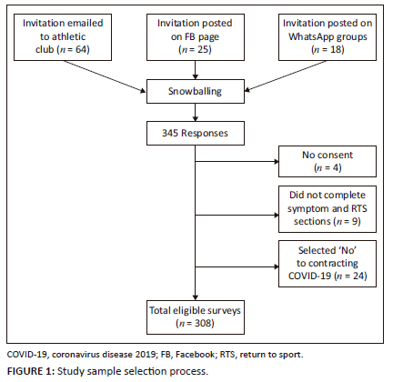 Our study is a cross-sectional survey-based observational to determine the difference in demographic and sport-specific characteristics, disease severity, duration, and symptoms, self-reported approach to RTS and exercise capacity, and fatigue score between athletes who had returned to their pre-illness level of sport and those who had not. The impetus for our study was the threat of COVID-19 consequences in athletes over the age of 35 years, doing a high volume of cardiovascular exercise. Participants were recruited by snowball sampling from athletic clubs in South Africa between December 2021 and July 2022. Emailers were sent to 64 athletic clubs containing the invitation to participate in the online survey and a request to forward it on to their members. The invitation was also disseminated via social media to 18 WhatsApp groups and 25 Facebook pages. Athletic clubs approved the post on their social media pages and chats. Invitations could then be forwarded by the recipients in a snowball fashion to fellow athletes.