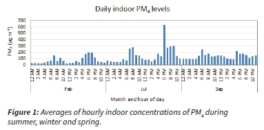 Measured PM4 concentrations displayed seasonal variation with concentrations being higher in winter compared to spring and summer (Figure 1). Increased burning/heating activities during winter periods leads to increased ambient concentrations that are contributing to increased levels of PM exposure indoors. Reduced ventilation by closing windows and doors to keep warm during winter also likely trapped PM4 inside thus increasing the indoor concentrations. Daily indoor PM in winter and spring exceeded concentration standards and guidelines, namely South Africa's National Ambient Air Quality Standards (NAAQS) and those of the WHO. A distinct diurnal pattern in PM concentrations was observed during the study period with peaks occurring in the early mornings and evenings. These coincided with the times of the day during which combustion for cooking and space heating usually occurred. Results also showed that measured indoor temperatures were extremely high. Household occupants are therefore vulnerable to heat-related illnesses due to exposure to elevated temperature.