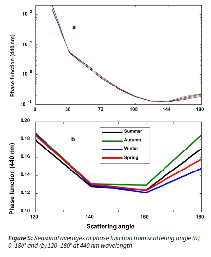 Phase function relates to the intensity and angular distribution of the scattering of the incident stream of light by the particles. It is influenced by the internal structure, size distribution, shape of particles and the refractive index (Bi et al., 2011; Bibi et al., 2016). The scattering angle depends on the non-sphericity of the particles. The phase function (Figure 5) is maximum at small angles for all seasons. The minimum value of the phase function occurs at 140° (see Figure 5b), while it is maximum at 0°. More backscatter occurs during the autumn and the summer that shows the predominance of coarse particles during those seasons. Climate forcing estimation and resolution of atmospheric correction problems are linked with phase functions at angles greater than 90° (Bibi et al., 2016; Kokhanovsky, 1998).